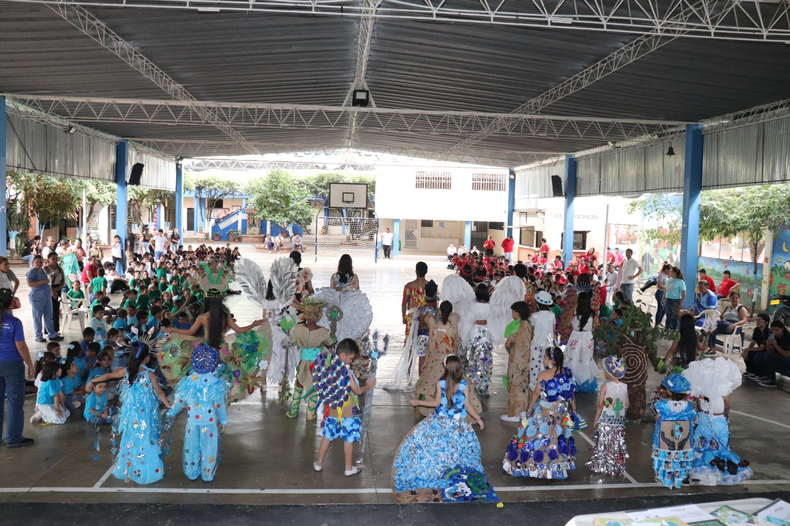 La actividad inició con un llamativo desfile ecológico, donde los estudiantes presentaron creativos trajes confeccionados a partir de materiales reciclables, evidenciando su ingenio y compromiso ambiental.